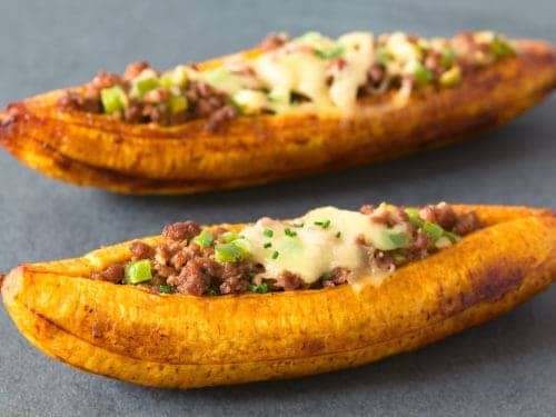 - 2 plátanos machos maduros pelados y cortados a lo largo por la mitad